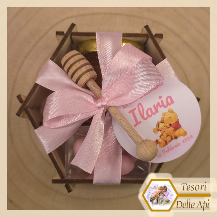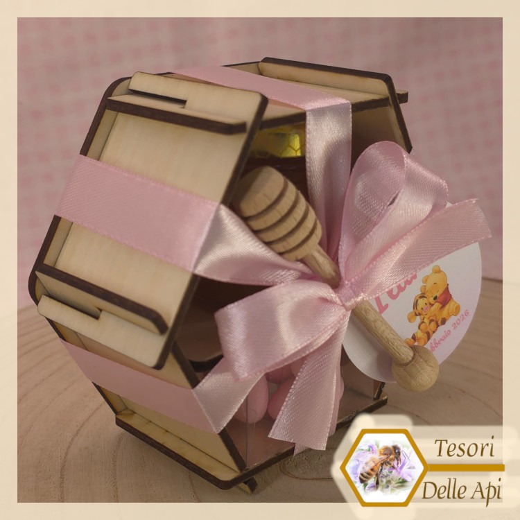 Vasetto Miele e Confetti in Scatola Esagonale di Legno con Spargimiele e Cartoncino Personalizzato