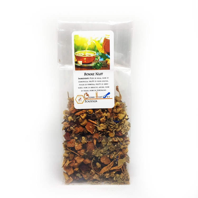Tisana Bonne Nuit Scegli il formato: 20g - 50g - 100g Mela pezzi, camomilla fiori, rosa canina frutti, verbena foglie, ribes nero frutti, fiori di arancio petali, aromi, tiglio fiori, fiordaliso petali. Per una notte serena e calma.Sacchetto Tisana Bonne Nuit